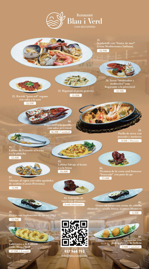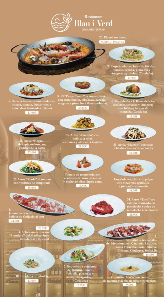 En Blau i Verd te ofrecemos una cocina mediterránea global, porque nuestra intención es la búsqueda de los platos más representativos de los 24 países que lo integran, ya sea del Mediterráneo occidental, central u oriental.